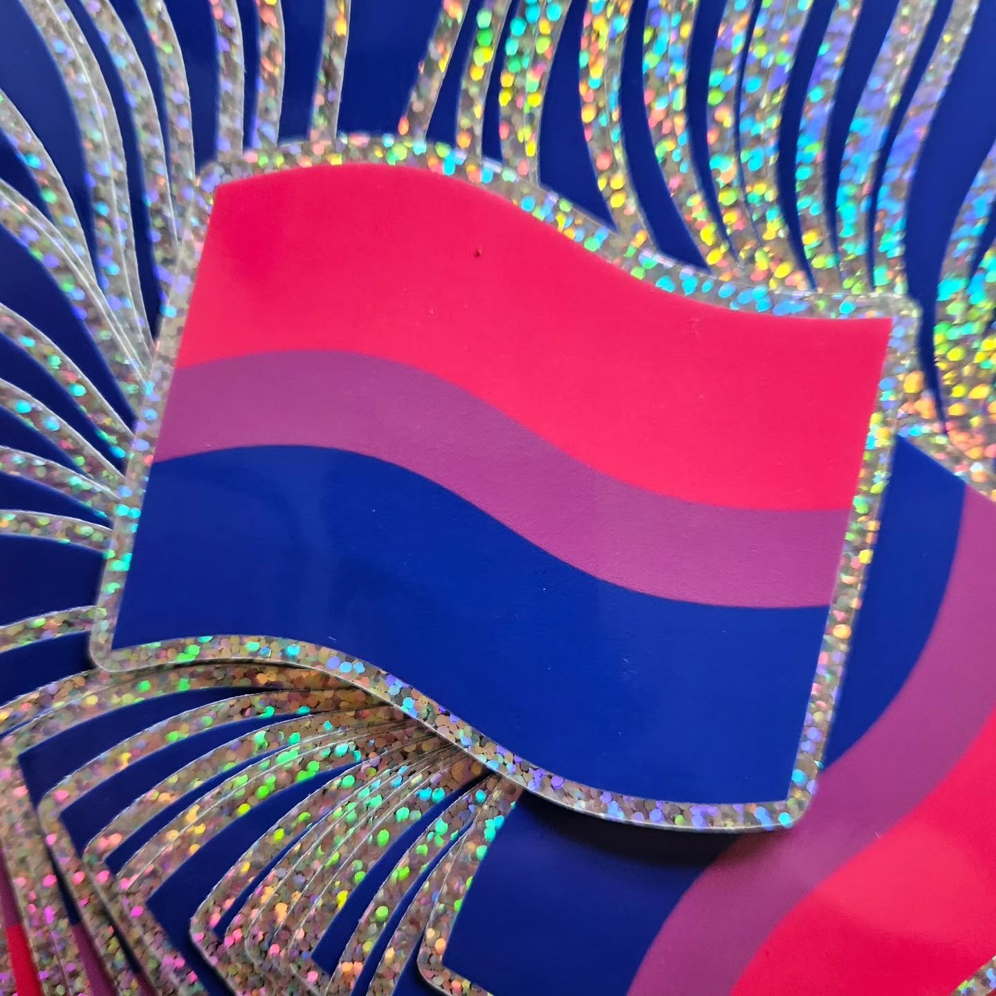 This waving bi flag sticker is a great size for your phone or water bottle. It’s thick and bright, with a glittery border that glistens as it moves.